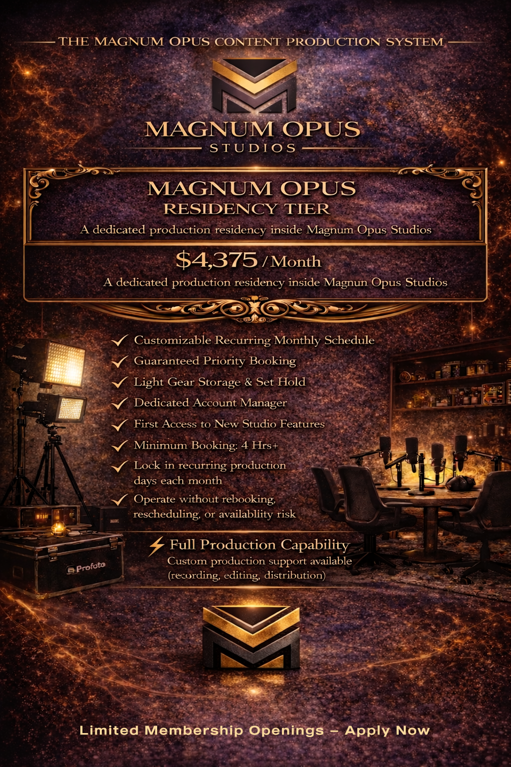 The Residency Tier is a $4,375/month membership that includes 56 hours of studio time each month. Members receive a customizable recurring monthly schedule, guaranteed priority booking, light gear storage and set hold, a dedicated account manager, and first access to new studio features. This tier is designed for brands, podcasts, teams, and creators who need a dedicated production residency inside Magnum Opus Studios.